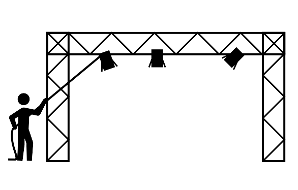 A well-equipped platform with lighting rigs, backdrop screens, and stage automation.
